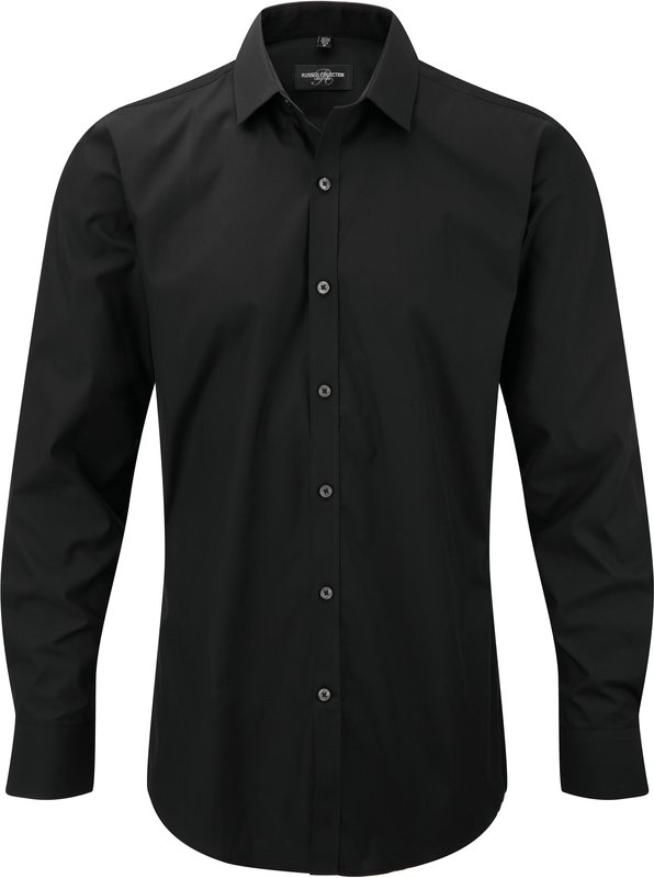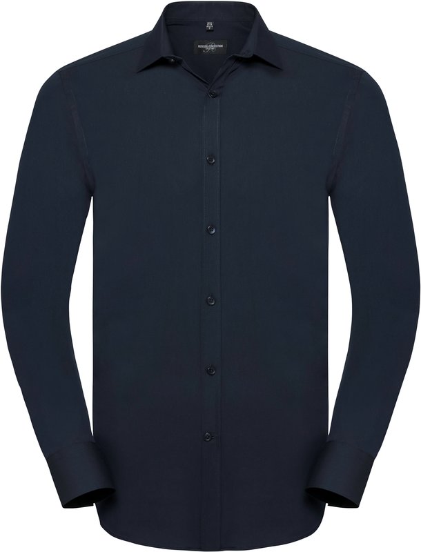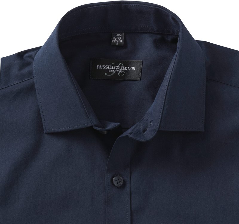 75% coton / 25% élastomultiester (fibre Lycra® T400). Cette nouvelle fibre apporte confort, élasticité, tenue durable et gestion de l’humidité. Col semi-évasé et rabat court. Patte de boutonnage étroite. Pinces au dos. Manchettes carrées avec option boutons de manchette. Coupe ajustée.