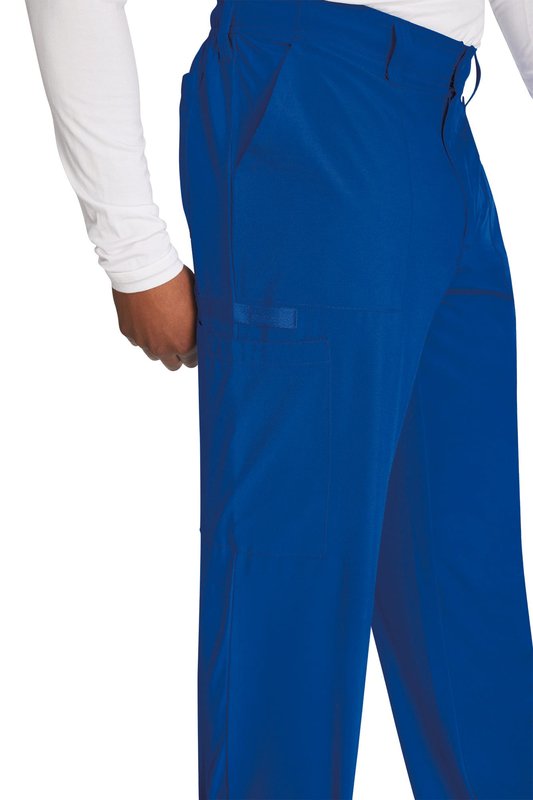 95% polyester / 5% élasthanne. Coupe masculine. Ceinture élastique au dos avec cordon intérieur. Braguette zippée avec fermeture à bouton. Cinq passants de ceinture. Six poches : deux poches frontales plaquées, deux poches cargo, deux poches arrière. Bande en sergé utilitaire boucle d’instrument.
