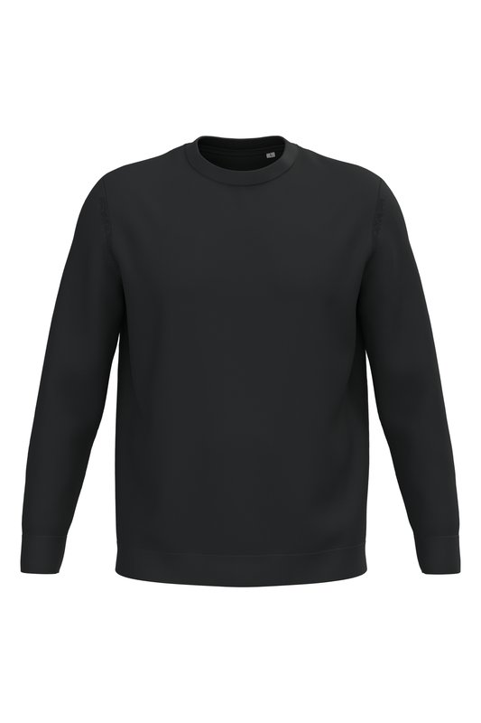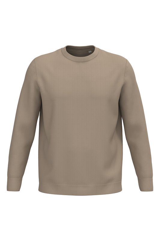 100% coton biologique. Coton peigné. Jauge 12. Coupe droite. Bord côte 1 x 1 col, bas de vêtement et bas de manches. Tricoté en « Fully Fashion ». Finition intérieur col avec bande de propreté en matière principale ton sur ton. Traitement anti-bouloche. Poids moyen en taille L : 270 g.