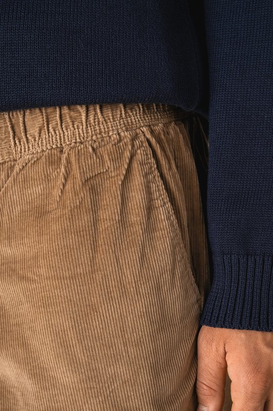 98% coton biologique / 2% élasthanne recyclé. Tissé. Tissu en velours côtelé. Ceinture élastiquée avec cordon de serrage plat en coton biologique contrasté sur toutes les couleurs. Œillets intérieurs brodés permettant de mettre le cordon à l’intérieur. Embout de cordon et œillet en métal recyclé. Braguette avec surpiqûre, boutons pressions et zip cachés en métal recyclé. Deux poches côtés avec surpiqûre. Deux poches passepoilées au dos avec piqûre nervure. Fourche devant et dos avec double surpiqûres pour plus de renfort. Finition ceinture intérieure avec biais ton sur ton. Ourlet simple surpiqûre bas de vêtement. Vêtement lavé après montage : les couleurs peuvent légèrement varier d’une pièce à l’autre.