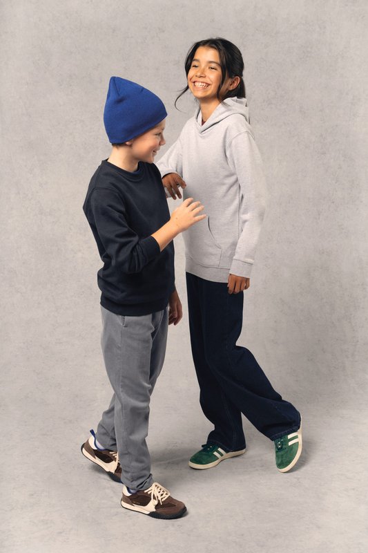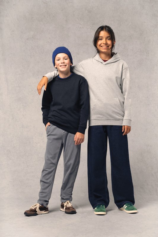 50% coton ring-spun / 50% polyester recyclé post consumer. Molleton gratté. Coupe droite. Coupé c…