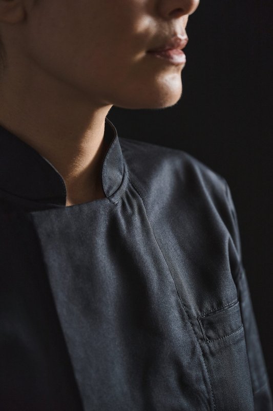 65% polyester recyclé / 35% coton. Tissu twill. Lavage industriel et/ou lavage domestique 60°C. Coupe droite. Col mao. Bande de propreté intérieure col en twill ton sur ton. Une poche poitrine passepoilée surpiquée et une poche stylos sur la manche, côté gauche au porté. Fermeture croisée avec boutons pressions en métal dissimulés sous la patte. Fentes latérales. Ourlets bas de manches et bas de vêtement. Pochette RFID bas du vêtement au-dessus des labels. Etiquette de marque détachable.