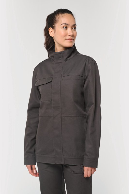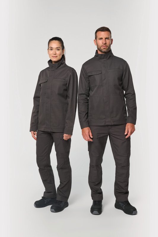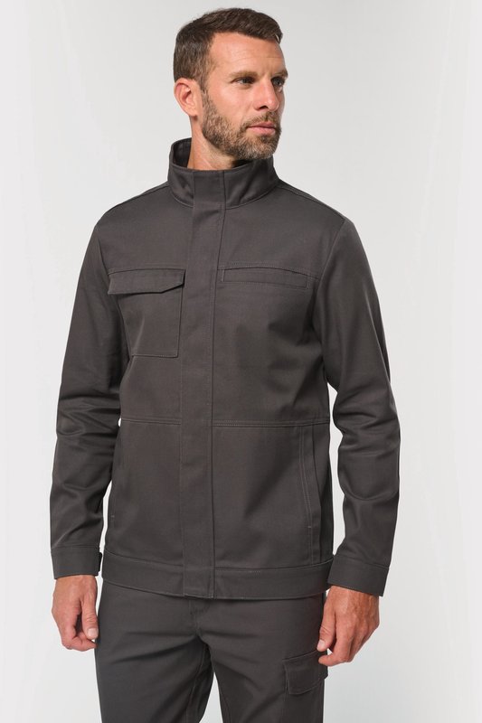 60% coton / 40% polyester. Tissu twill. Lavable à 60°C. Coupe standard. Col montant. Deux poches plaquées côtés, une poche poitrine passepoilée et une poche poitrine plaquée fermée par un rabat avec bandes auto-agrippantes. Fermeture zippée en plastique noir dissimulée sous une patte maintenue par des bandes auto-agrippantes. Empiècement dos avec deux plis d’aisance apportant plus de confort et de liberté de mouvement. Bas de manches et bas de vêtement ajustable à l’aide de bandes auto-agrippantes. Etiquette de marque détachable.